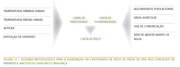 A metodologia utilizada para a definição das áreas com maior risco relativamente a vagas de frio baseou-se em elementos estatísticos (dados climáticos) e cartográficos (Figura 13).
