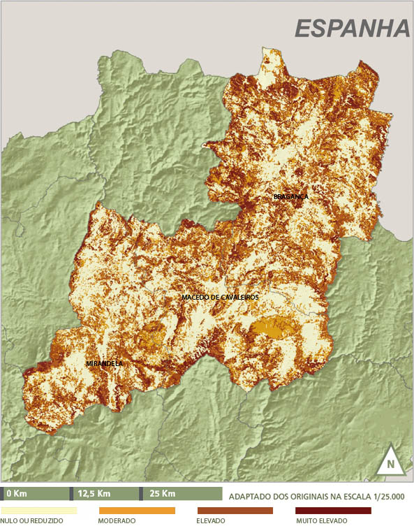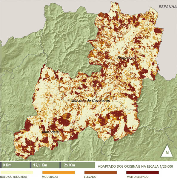 No concelho de Bragança corresponde à serra de Montesinho e nas vertentes dos principais cursos de água: rio das Maças, rio Sabor principalmente na parte SE, ribeira dos Veados (na freguesia de Calvelhe) e Cabeço da Espiga (a SW da albufeira de Castanheira). Por sua vez, as áreas com maior vulnerabilidade correspondem às áreas florestais de folhosas e aos olivais que se localizam em aras classificadas tendo mancha mais contínuas na parte Oeste do concelho.