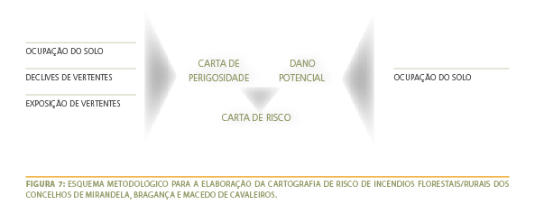 Foi adoptada a metodologia apresentada no Guia Metodológico para a elaboração dos PMDFCI (Plano Municipal de Defesa da Floresta Contra Incêndios) disponibilizado pela Direcção-Geral de Recursos Florestais (DGRF) em 2007. As variáveis utilizadas para os diferentes cartogramas intermédios foram as seguintes (Figura 7):