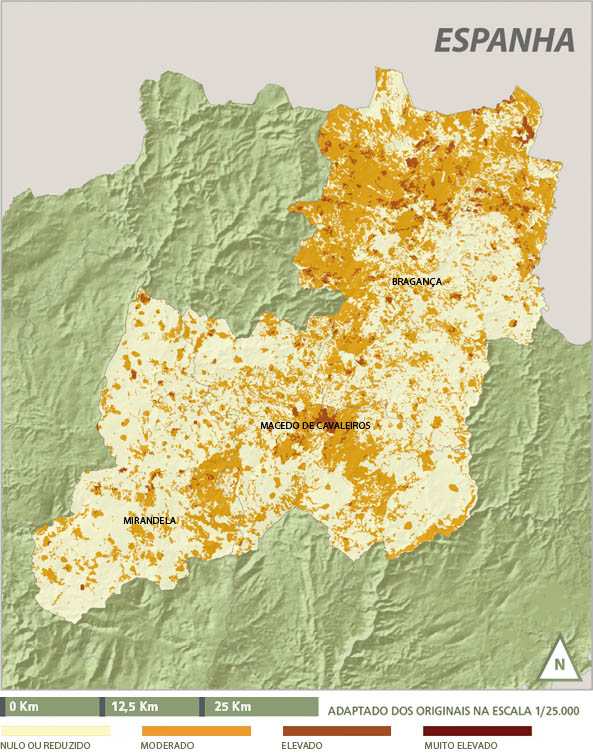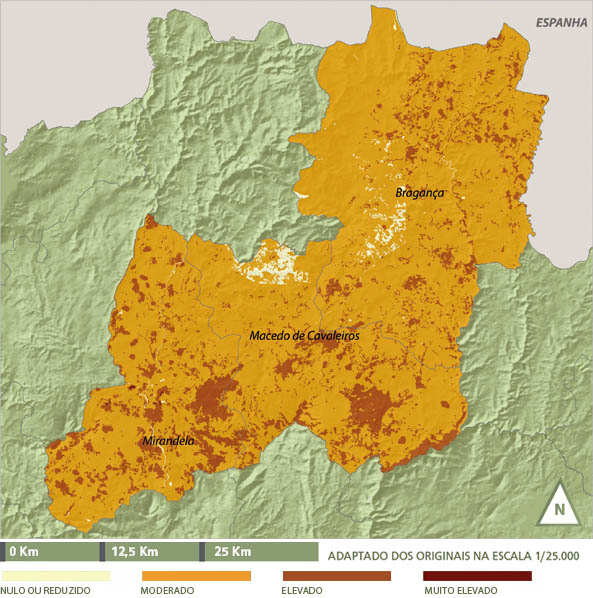 Quanto às áreas de maior vulnerabilidade correspondem às áreas sociais. Por sua vez, as diferenças mais evidentes são delimitadas pelo património natural, ou seja, as manchas que correspondem a áreas legalmente protegidas (Parque Natural de Montesinho e serra da Nogueira) apresentam uma vulnerabilidade moderada e correspondem à parte norte e oeste. Por sua vez, a restante área do concelho apresenta vulnerabilidade maioritariamente nula a reduzida.