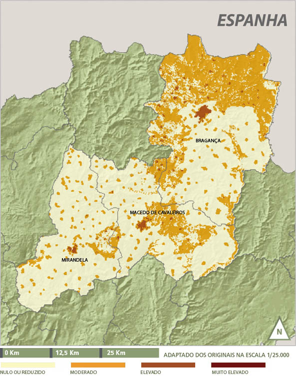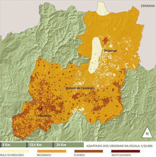 Quanto ao risco, somente a cidade de Mirandela apresenta risco muito elevado. Os restantes aglomerados populacionais apresentam risco elevado. Será importante realçar que na região da serra de Santa Comba o risco é elevado, o que poderá estar relacionado com a ocorrência de incêndios florestais. O sector sul apresenta-se, maioritariamente, como moderado.
