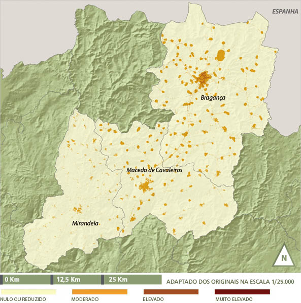 Bragança é o único dos três concelhos a revelar pequenas áreas onde o risco maior quanto à ocorrência de nevões (elevado) corresponde às áreas sociais e vias de comunicação (IP4) e ao Aeroporto Regional de Bragança. Nessas áreas o risco apresenta-se na sua maioria moderado, mas pode também ser elevado, em pequenos sectores.