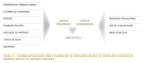 Ocorrências anteriores – a única informação existente para a elaboração desta variável correspondeu aos dados extraídos das normais climatológicas (período de 1961-1990) mais precisamente, ao número de dias com solo coberto de geada. Para tal, utilizaram-se as estações de Bragança, Mirandela e Mogadouro do Instituto de Meteorologia. As ponderações foram estabelecidas de modo semelhante à variável anterior;