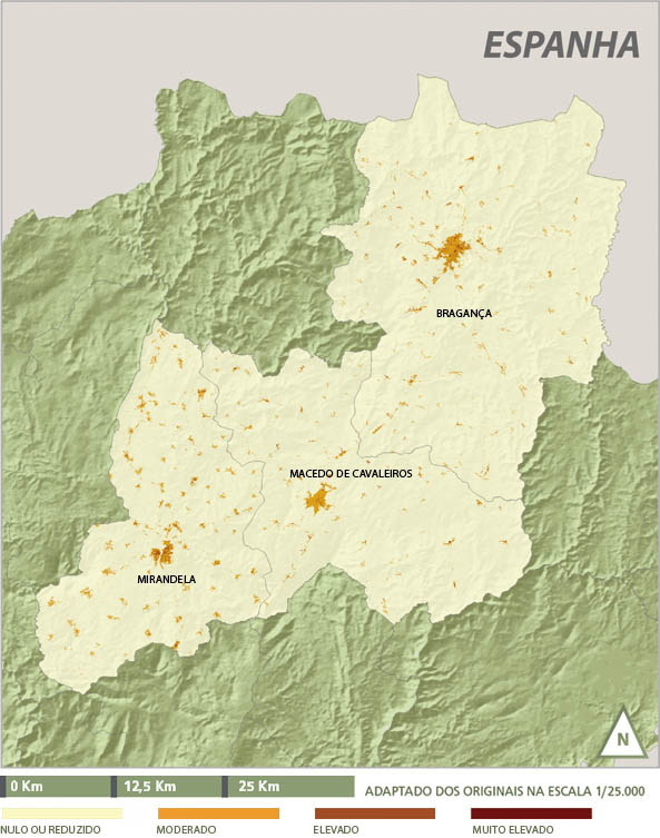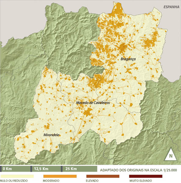 Por sua vez, ao nível da vulnerabilidade definem-se os graus de vulnerabilidade reduzida a moderada, sendo que este último corresponde às principais áreas sociais, principalmente à cidade de Bragança (nalguns sectores da cidade a vulnerabilidade é elevada). A restante área do concelho apresenta vulnerabilidade reduzida.