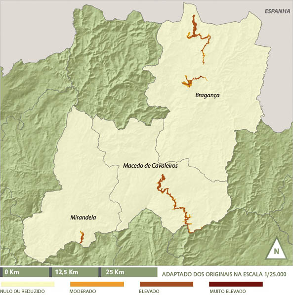 No concelho de Bragança foram definidas como áreas inundáveis as localizadas a jusante das barragens de serra Serrada e de Gostei. Desse modo, e considerando o volume de armazenamento de cada um desses elementos, as áreas afectadas corresponderiam ao vale do rio sabor até às proximidades da cidade de Bragança (Atalaia) no caso da barragem da serra Serrada, e ao vale superior do rio Fervença no caso da barragem de Gostei. Na área do vale do Sabor, ocorre perigosidade elevada na parte superior do vale (ribeira de Andorinhas). É muito elevada nas povoações de França e de Rabal. No caso da barragem de Gostei, há a registar perigosidade muito elevada na cidade de Bragança, uma vez que o rio Fervença atravessa a cidade poucos quilómetros a jusante da barragem.