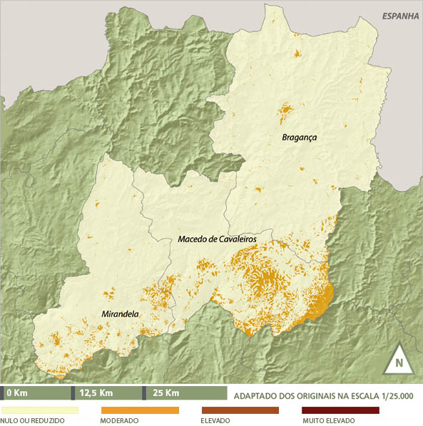 Quanto à vulnerabilidade, esta é maioritariamente reduzida e moderada em todo o território do concelho de Mirandela, à excepção de pequenos sectores onde se apresenta elevada (cidade de Mirandela).