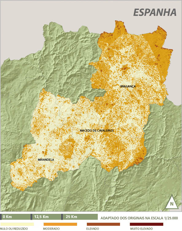 Quanto à vulnerabilidade, esta é maioritariamente reduzida e moderada em todo o território do concelho de Mirandela, à excepção de pequenos sectores onde se apresenta elevada (cidade de Mirandela).