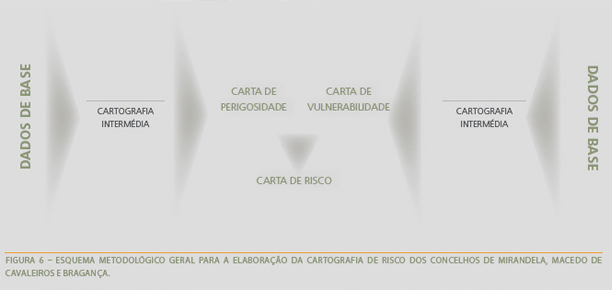 Assim sendo, a metodologia adoptada segue a mesma linha de orientação para todos os tipos de risco, segundo quatro níveis de informação (Figura 6): (i) Dados de Base – informação necessária à avaliação de cada tipo de risco, resultante de cartografia prévia, de informação oral, de pesquisa documental em periódicos e em outras fontes bibliográficas e do levantamento de campo, a qual resultará na Cartografia Intermédia; (ii) Cartografia Intermédia – elaborada com os Dados de Base com vista a estabelecer a Perigosidade e a Vulnerabilidade em cada tipo de Risco; (iii) Cartas de Perigosidade e de Vulnerabilidade e (iv) Carta de Risco – resulta do cruzamento entre as cartas de Perigosidade e de Vulnerabilidade, tratando-se do Risco efectivo para o Homem, as actividades humanas e/ou os elementos naturais do Ambiente.